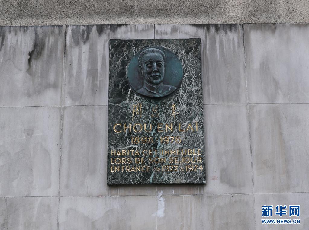 这是2021年4月11日在法国巴黎十三区戈德弗鲁瓦街上的“海王星旅馆”外拍摄的带有周恩来头像浮雕的纪念牌。新华社记者 高静 摄