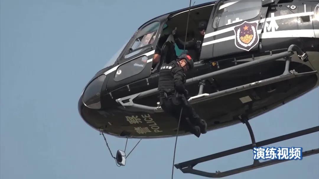 “空地一体”突击攻坚处置展示了巡特警支队强大的机动性能和攻坚能力,突击队员快速到达目标位置形成“空地联动”,直升机悬停,突击队员“空中索降”,迅速对屋内目标进行武力封控,突击组从窗户投入爆震弹、迅速破门突入并成功制服歹徒。“地空联动”的现代警务机制有效地提高了巡特警处置突发性事件的应急处理能力,提升了公安队伍正规化、专业化、职业化水平。