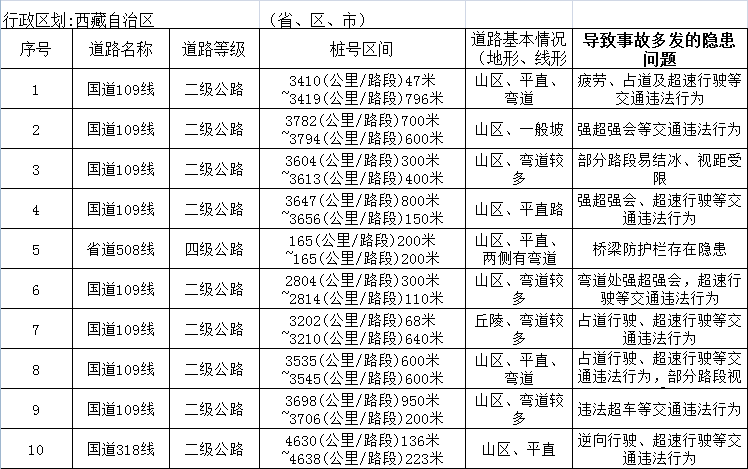 根据交通大数据,西藏交警统计并公布了全区十大道路交通事故多发路段,广大驾驶员在途经这些路段时,一定要谨慎安全驾驶。