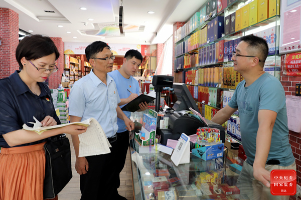广西壮族自治区凤山县纪委监委紧盯重大节假日,联合市场监督局、卫生监督所等部门,深入土特产店、高档烟酒店、机关食堂等督查暗访,严防“四风”问题反弹回潮。图为联合督查组深入烟酒店、机关食堂等开展督查。(广西壮族自治区凤山县纪委监委 李知龙 摄)
