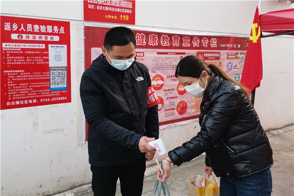 在白云楼社区,该市纪委监委办公室干部刘涛正在为进出人员测量体温。从腊月二十七至大年初七,市纪委监委机关、市委巡察办共有330人次参与下沉社区疫情防控工作,以实际行动守护社区居民平安过节。