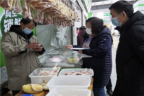 沙洋县纪委监委工作人员在集贸市场查看冷冻食品经营户的商品核酸检测情况。(摄影/周红艳)