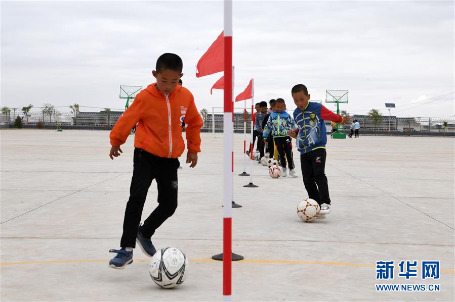 在甘肃武威市古浪县黄花滩生态移民区富民新村富民小学,足球兴趣小组的孩子们开展训练(2019年8月22日摄)。 新华社记者 范培珅 摄