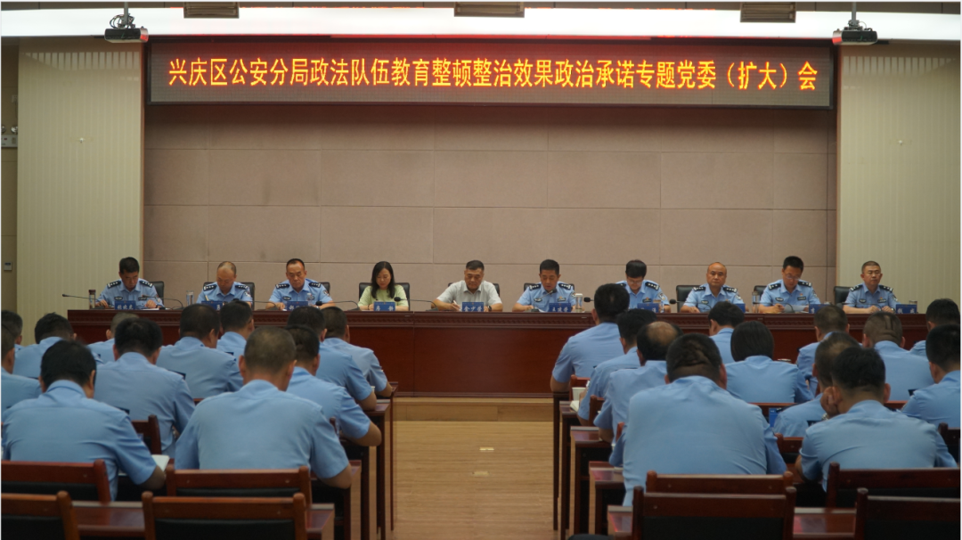 2021年7月5日下午,兴庆区公安分局召开党委(扩大)会议,专题通报分局政法队伍教育整顿整治成效,分局党委、党委班子成员分别作出政治承诺。自治区政法队伍教育整顿第一驻点指导组公安专班组长、公安厅二级警务专员金少荣出席会议。会议,由兴庆区政府副区长、公安分局党委书记、局长王建荣主持。兴庆区委政法委副书记房静到会指导,分局党委班子成员、各党支部书记参加会议。