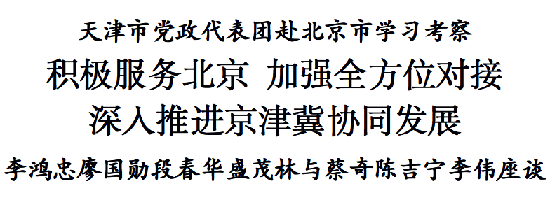 16日,天津市党政代表团赴北京市学习考察,深入贯彻落实习近平总书记关于京津冀协同发展一系列重要讲话和重要指示批示精神,坚决落实党中央、国务院决策部署,推动两市合作交流、协同发展取得新成效。市委书记李鸿忠,市委副书记、市长廖国勋,市人大常委会主任段春华,市政协主席盛茂林与北京市委书记蔡奇,市委副书记、市长陈吉宁,市人大常委会主任李伟座谈。