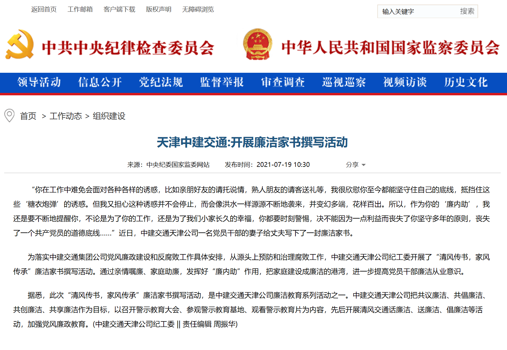为落实中建交通集团公司党风廉政建设和反腐败工作具体安排,从源头上预防和治理腐败工作,中建交通天津公司纪工委开展了“清风传书,家风传承”廉洁家书撰写活动。通过亲情嘱廉、家庭助廉,发挥好“廉内助”作用,把家庭建设成廉洁的港湾,进一步提高党员干部廉洁从业意识。