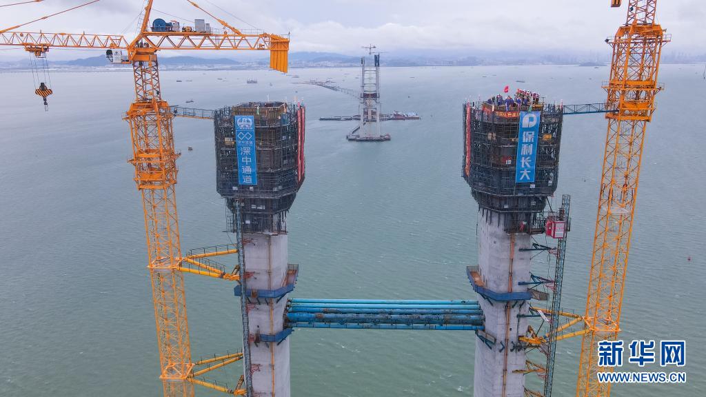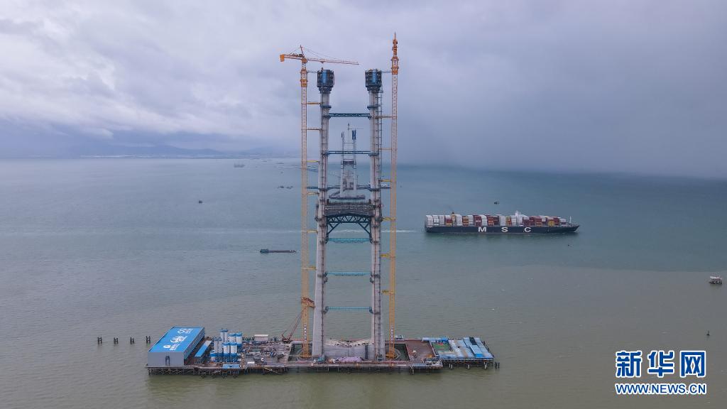 广东省中山市深中通道建设工程伶仃洋大桥西索塔封顶现场(7月19日摄,无人机照片)。新华社发(陈旭彬 摄)