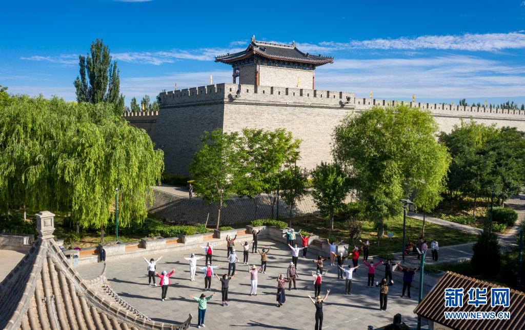 6月18日,宁夏盐池县居民在城墙脚下跳广场舞(无人机照片)。新华社记者 冯开华 摄