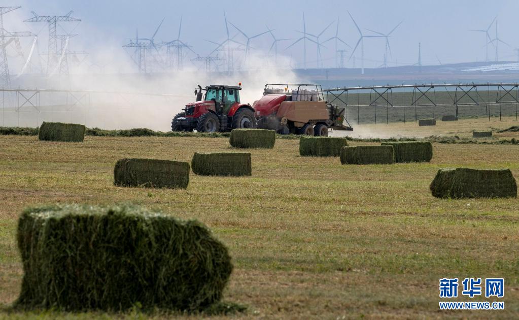 在宁夏盐池县冯记沟乡平台村的优质牧草基地,农户用机械将牧草打捆(7月14日摄)。新华社记者 杨植森 摄