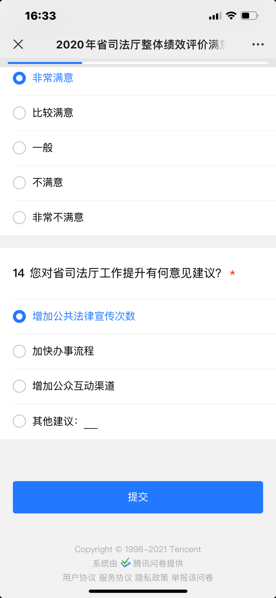 为了客观了解人民群众对贵州省司法厅2020年度绩效评价满意度,受贵州省财政厅委托,现诚邀您在百忙之中抽出时间参与本次问卷调查。我们将根据您的意见建议不断改进工作,努力提升各项工作水平。期待您的参与!谢谢!