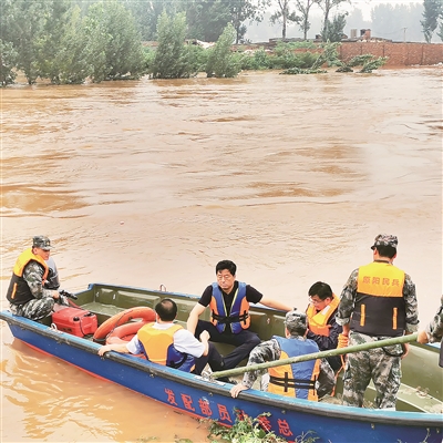 连日来,河南省新乡市遭遇暴雨袭击,部分地区公共交通受阻,群众被困。新乡市纪委监委干部冲锋一线,既督又战,守护群众生命财产安全。图为该市纪检监察干部组成突击队,前往营救受困群众。 王鹏 摄