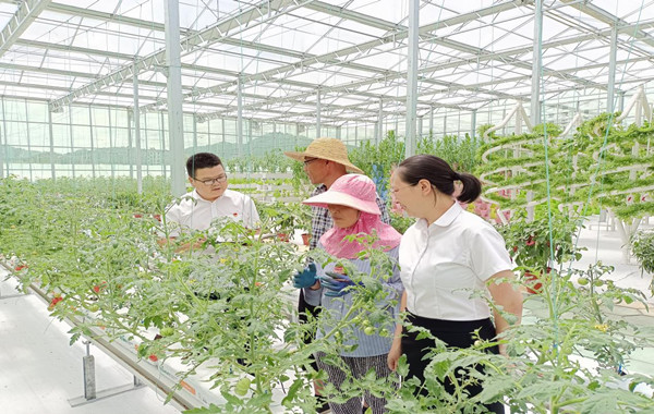 图为竹溪县中峰镇纪委干部在青草坪村有机农业示范园了解生态农业项目推进情况