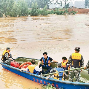 连日来,河南省新乡市遭遇暴雨袭击,部分地区公共交通受阻,群众被困。新乡市纪委监委干部冲锋一线,既督又战,守护群众生命财产安全。图为该市纪检监察干部组成突击队,前往营救受困群众。王鹏 摄