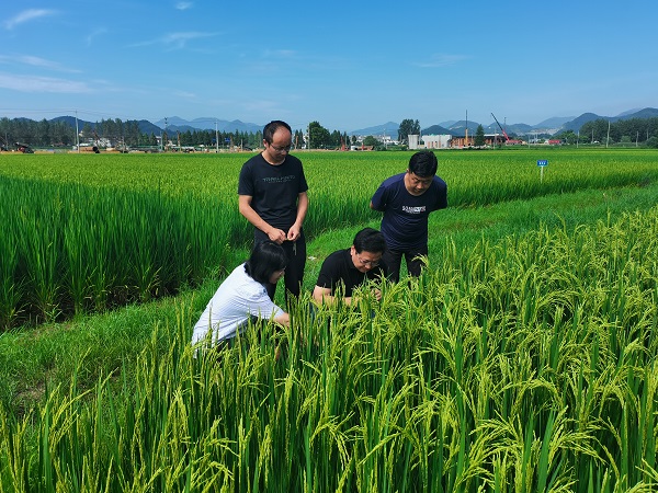 图为7月20日,驻市农业农村局纪检监察组工作人员与农技专家一起察看水稻长势情况。