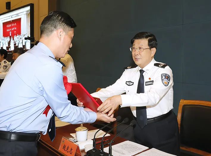 7月27日,全国公安机关庆祝建党100周年安保维稳工作总结表彰电视电话会议在京召开。图为国务委员、公安部党委书记、部长赵克志为受表彰代表颁奖。满博摄影