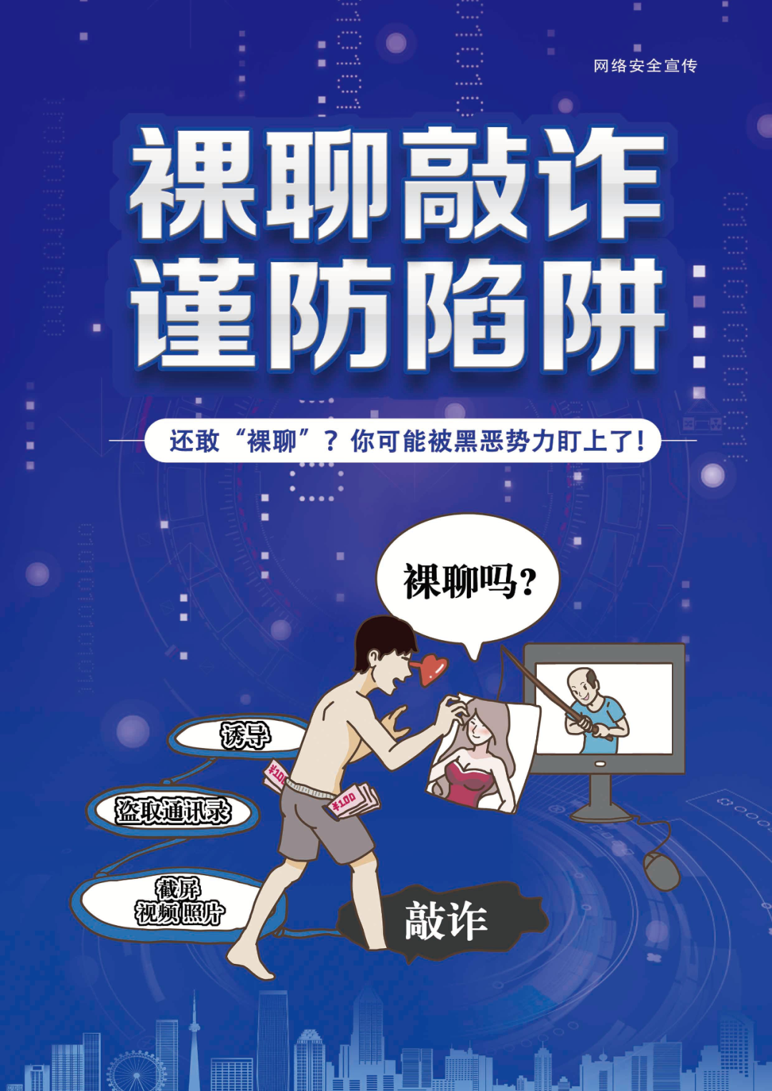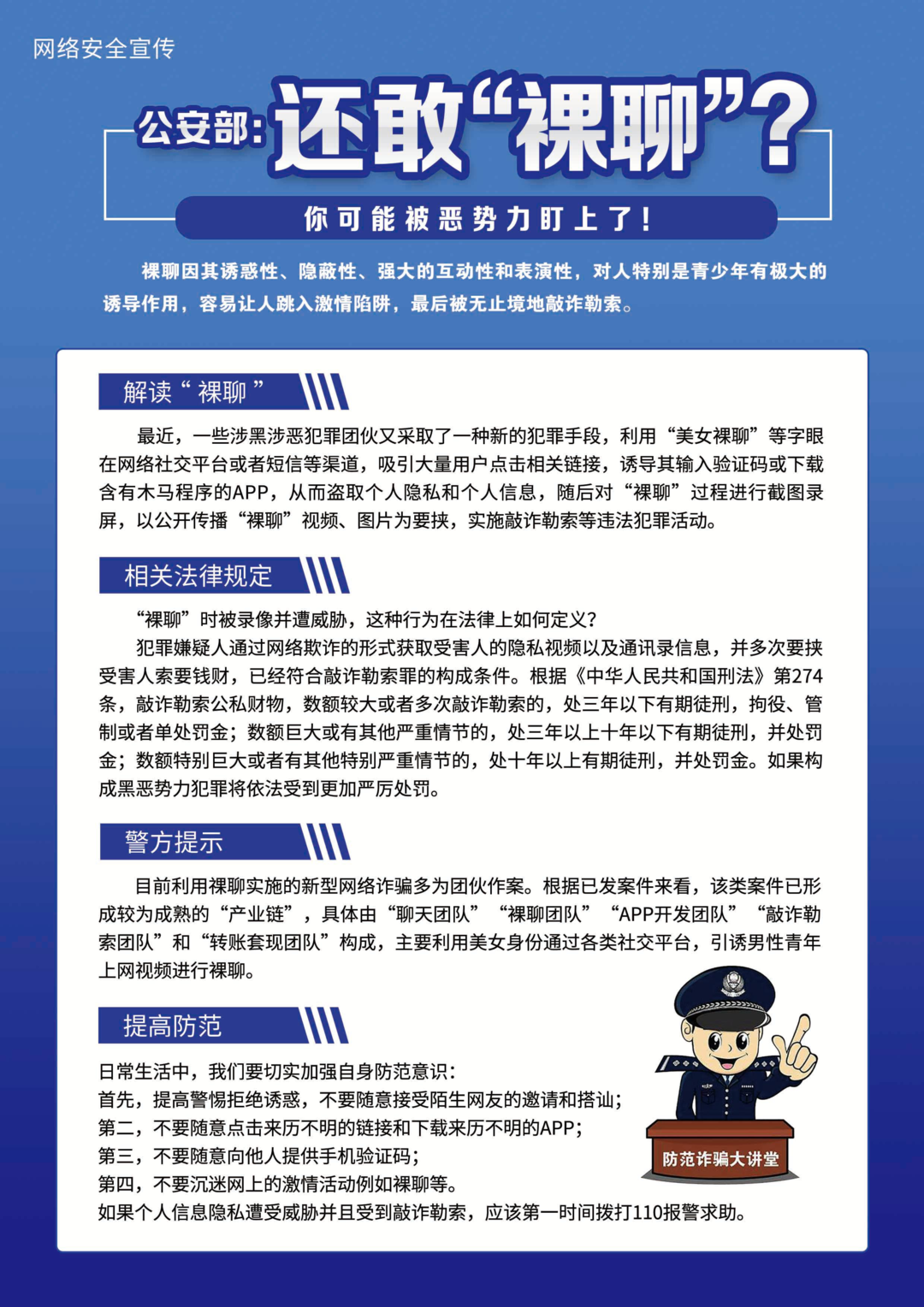 民警提示:“裸聊”敲诈案件犯罪分子往往以美女形象通过互联网通讯软件物色受害人,交往中提出“裸聊”进行诱惑,后推送含有木马的APP或链接诱骗受害人下载或点击,进而获取受害人通讯录、短信等信息,并引诱受害人“裸聊”,录下不雅视频,最终以在受害人的亲戚、朋友中散播不雅视频相要挟,敲诈勒索受害人钱财。 不要“裸聊”,不下载任何不明来路的APP,不向任何陌生人转账汇款。一旦上当被威胁第一时间选择报警而不是选择花钱免灾。