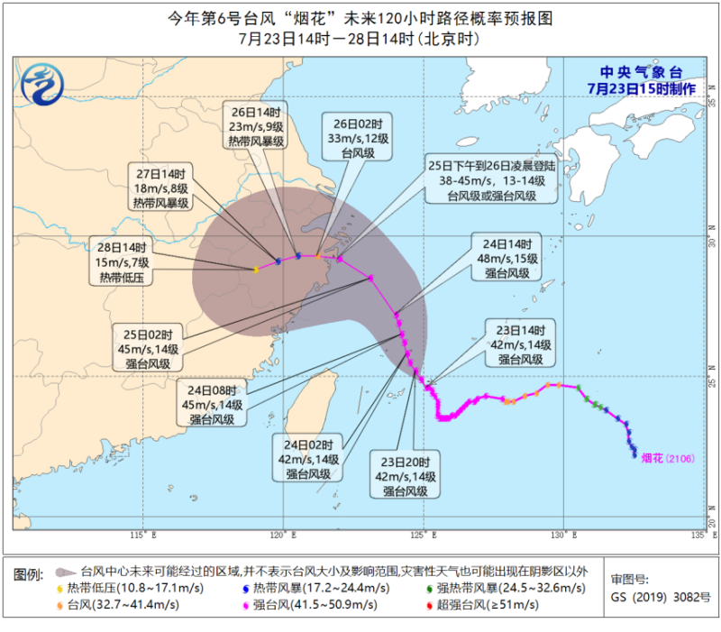 据省气象台信息发布,台风“烟花”中心距离浙江省象山县南偏东方向约620公里(北纬24.6度、东经125.1度),中心附近最大风力14级(42米/秒,强台风级),预计将以每小时10公里左右的速度向北偏西方向移动,于25日白天在浙江沿海登陆 。随着台风进一步靠近华东沿海未来三天福建全省多阵雨或雷阵雨其中北部地区部分中雨,局部大到暴雨外出时注意携带好雨具。