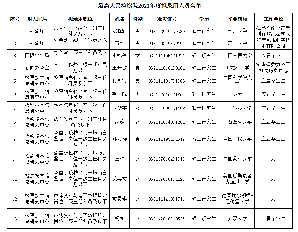 根据2021年度中央机关及其直属机构考试录用公务员工作有关要求,经笔试、面试、体检、考察等程序,经研究,确定姚晓辉等13名同志为最高人民检察院2021年拟录用人员,现予公示。公示期间如有异议,请向最高人民检察院政治部反映。