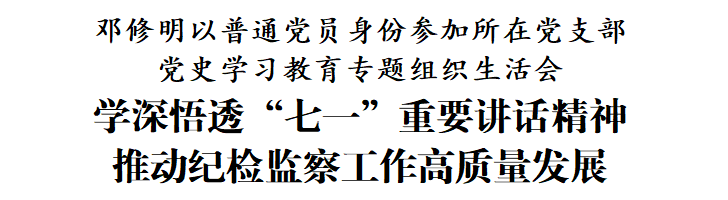7月27日下午,市委常委、市纪委书记、市监委主任邓修明以普通党员身份参加所在的市纪委监委办公厅秘书处党支部党史学习教育专题组织生活会,与支部党员同志一起,深入学习领会习近平总书记“七一”重要讲话精神,交流学习体会,查找差距不足,深刻剖析原因,提出整改措施和努力方向。