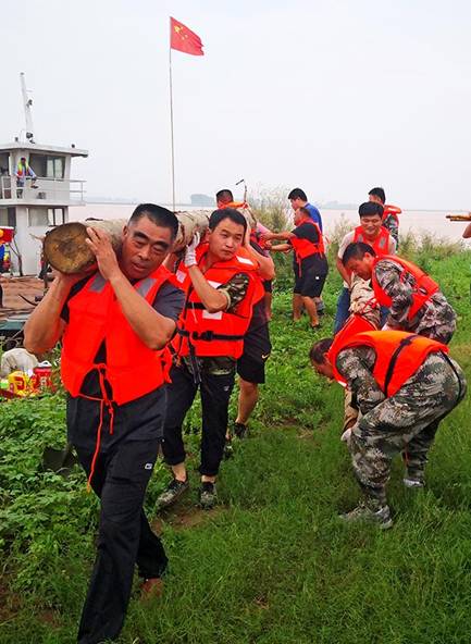 开封市兰考县东坝头镇纪检监察干部与镇应急队伍一同对拆除后浮桥桥体开展锚固抢险作业。陈涛/摄