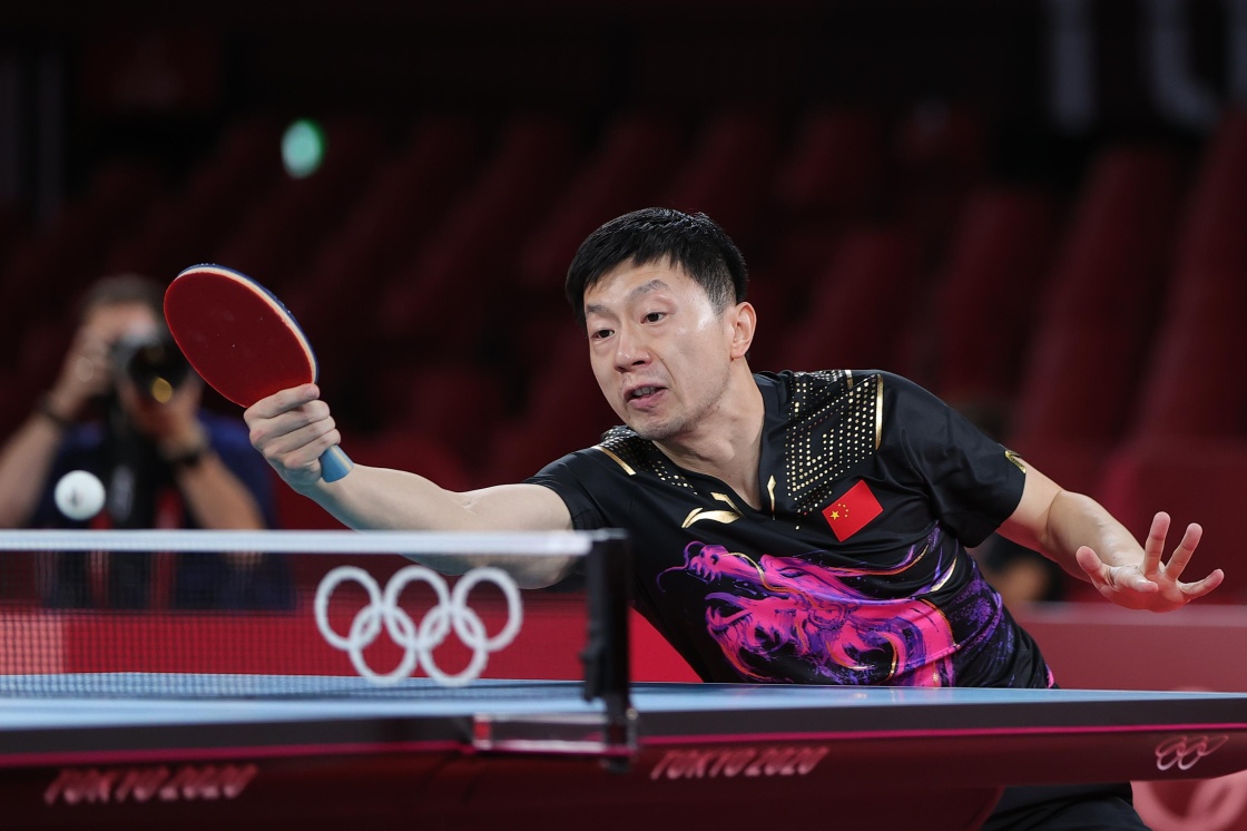 7月30日,东京奥运会乒乓球男子单打决赛中,中国选手马龙对阵中国选手樊振东。图为马龙在比赛中。 新华社记者 王东震 摄