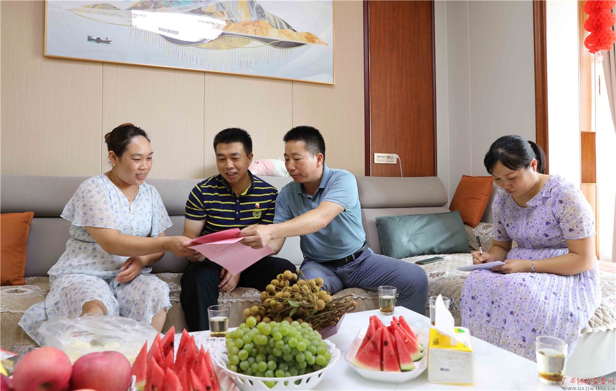 图为融安县市场监督管理局党组书记、局长李燕回到县市场监督管理局班子成员家里开展一把手”廉政家访,向其家属发放《致广大领导干部家属的一封廉洁家书》