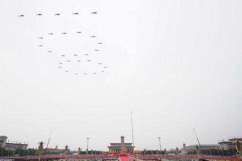 2021年7月1日上午,庆祝中国共产党成立100周年大会在北京天安门广场隆重举行。这是大会开始前的飞行庆祝表演(2021年7月1日摄)。新华社记者高洁 摄