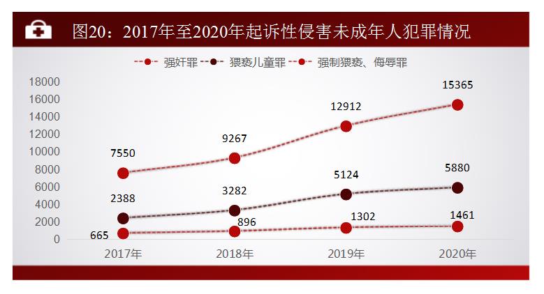2.性侵害未成年人犯罪增幅放缓。2020年,检察机关起诉强奸未成年人犯罪15365人、猥亵儿童犯罪5880人、强制猥亵、侮辱未成年人犯罪1461人,同比分别上升19%、14.75%和12.21%,增幅同比明显降低。但在疫情防控背景下,该类犯罪依然上升,暴露出预防和惩治性侵害未成年人犯罪工作还存在诸多薄弱环节,特别是一些导致案件发生的普遍性问题没有得到有效解决,如有的旅馆、宾馆、酒店、营业性娱乐场所、酒吧、网吧等场所违法接待未成年人,有的监护人监护不力、网络产品和服务提供者落实网络安全责任义务不到位等。同时,需进一步加强对未成年人及家长的防护教育,强化强制报告和入职查询制度落实,没完没了抓好“一号检察建议”监督落实等,有效促进未成年人保护社会治理工作深入开展。