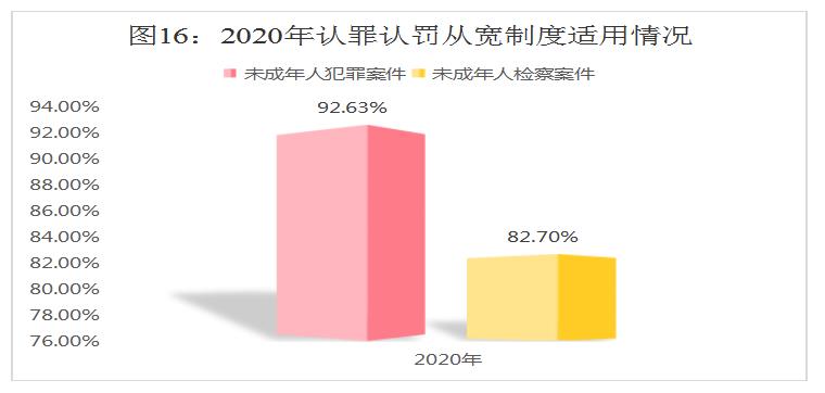 6.未成年人犯罪案件适用认罪认罚从宽制度比例高。2020年未成年人犯罪案件适用认罪认罚从宽制度为50062人,适用率92.63%。同期未成年人检察案件(包括侵害未成年人犯罪案件)适用认罪认罚从宽制度80437人,适用率82.7%,反映出认罪认罚从宽制度与未成年人司法理念高度契合,在未成年人犯罪案件中适用情况更好,更有利于教育挽救涉罪未成年人。