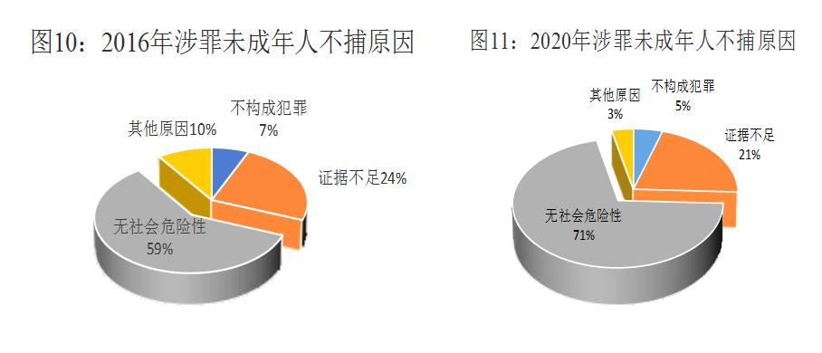 1.未成年人犯罪不捕率明显上升。2016年至2020年,未成年人犯罪不捕率逐年上升,分别为31.66%、33.59%、34.13%、34.43%、39.1%,2020年上升幅度达4.7个百分点,未成年人少捕政策进一步落实。从不捕原因看,2016年以来,因无社会危险性不捕人数呈增多态势,分别为8081人,8769人、9666人、10693人、10415人,占不捕人数的比例分别为59.48%、61.65%、63.57%、64.61%、70.81%,2020年同比上升6.2个百分点;因证据不足和不构成犯罪等原因不捕的比例进一步降低,反映司法理念和办案质量进一步提升。