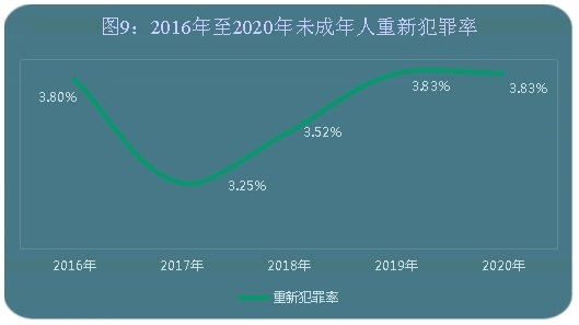 8.未成年人重新犯罪率整体平稳。2016年至2020年,检察机关受理审查起诉未成年人中曾受过刑事处罚的分别为2246人、1938人、2054人、2349人、2092人,分别占同期受理审查起诉未成年人总数的3.80%、3.25%、3.52%、3.83%、3.83%,保持在3%至4%之间,平均重新犯罪率为3.65%左右。
