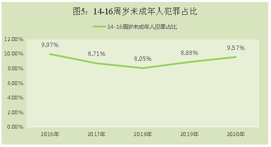 4.低龄未成年人犯罪占比有所回升。2016年至2020年受理审查起诉14至16周岁未成年人犯罪分别为5890人、5189人、4695人、5445人、5259人,占受理审查起诉全部未成年人的比例分别为9.97%、8.71%、8.05%、8.88%和9.57%,近两年呈上升态势。