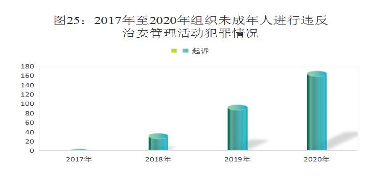 6.组织未成年人进行违反治安管理活动犯罪问题较为突出。2017至2020年,检察机关对组织未成年人进行违反治安管理活动犯罪提起公诉分别为4人、37人、98人、170人,增长较快,反映组织、拉拢未成年人进行违法犯罪问题越来越突出,亟需引起高度重视。