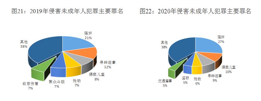 3.侵害未成年人犯罪类型更加集中。2020年,检察机关对侵害未成年人犯罪提起公诉人数居前六位的罪名、人数分别是强奸罪15365人、猥亵儿童罪5880人、寻衅滋事罪5098人、抢劫罪3474人、盗窃罪3033人、交通肇事罪2920人,其他21525人。前六类犯罪占提起公诉总人数的62.43%,与2019年基本持平。值得注意的是,与2019年相比,交通肇事取代故意伤害犯罪居第6位,反映未成年人出行安全问题需引起高度重视。