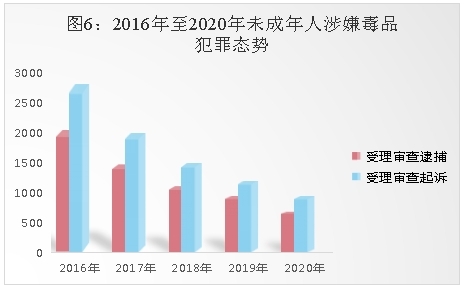 5.未成年人毒品犯罪五连降。2016年至2020年,检察机关受理审查逮捕未成年人涉嫌走私、贩卖、运输、制造毒品犯罪人数分别为2047人、1476人、1108人、945人、686人,受理审查起诉分别为2810人、2003人、1504人、1201人、942人。自2016年首次下降后,呈连续下降趋势,2020年较2016年受理审查逮捕、受理审查起诉人数均下降66.5%。