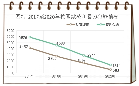 6.校园欺凌和暴力犯罪数量明显下降。2017年以来,检察机关批准逮捕校园欺凌和暴力犯罪人数分别为4157人、2785人、1667人、583人,同比分别下降33.00%、40.14%、65.03%,提起公诉人数分别为5926人、4590人、2914人、1341人,同比分别下降22.54%、36.51%、53.98%,经分析,未成年人在校时间减少、法治校园和安全校园建设力度加大是重要因素。