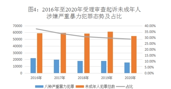 3.未成年人涉嫌严重暴力犯罪占比继续下降。2016年至2020年,受理审查起诉未成年人涉嫌故意杀人、故意伤害致人重伤或死亡、强奸、抢劫、贩卖毒品、放火、爆炸、投毒等八种严重暴力犯罪(因统计口径关系,将全部故意伤害、走私贩卖运输制造毒品犯罪均统计在内)分别为22028人、19954人、17936人、18172人、15736人,占全部犯罪人数的比例分别为37.29%、33.48%、30.76%、29.65%和28.63%,年均下降2.16%。