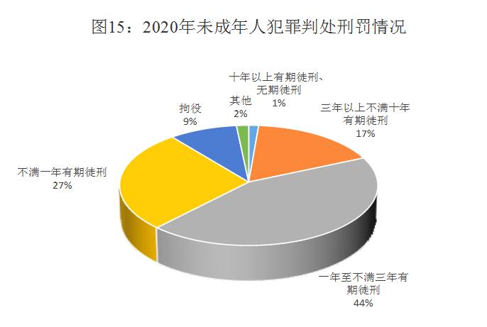5.被判处一年有期徒刑以下刑罚占比较高。2020年,检察机关提起公诉后,法院对未成年被告人作出生效判决31743人,其中无期徒刑50人,十年以上有期徒刑416人,三年以上十年(含十年)以下有期徒刑3949人,三年有期徒刑1420人,二年至不满三年有期徒刑4161人,一年至不满二年有期徒刑9690人,不满一年有期徒刑8688人,拘役2860人,管制79人,单处罚金227人,其他203人,判处不满一年有期徒刑、拘役人数占36.38%。