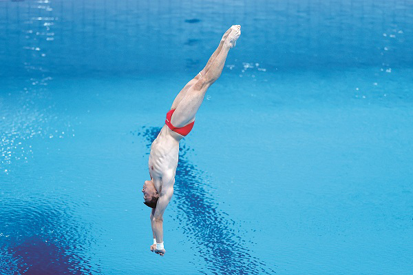 8月7日,在东京奥运会跳水男子10米跳台决赛中,中国选手曹缘夺得冠军,杨健获得亚军。图为曹缘在比赛中。(图片来源:视觉中国)