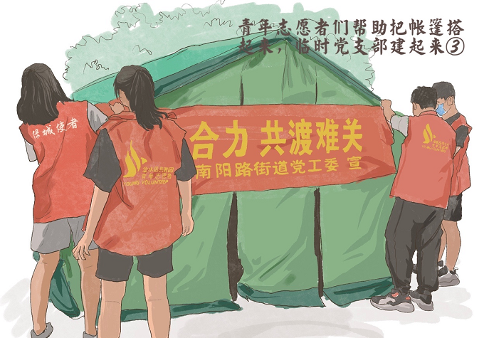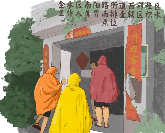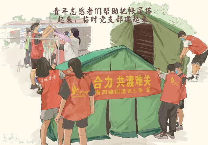 无论是防汛救灾还是疫情防控,越是困难的时候,越是考验党员干部的关键时刻,越是受灾疫情严重的地方,共产党员越是应该发挥带头作用。面对双重考验,广大党员干部始终以保护人民群众生命财产安全为首要任务,与汛情抗争,与疫情做斗争,带头冲在防汛减灾最前沿,带头承担最危险、最繁重的任务,哪里有险情、哪里有群众需要,哪里就有他们忙碌的身影¨¨¨郑州市金水区党员志愿者用画笔描绘了一幅幅真实而感动的抗汛防疫画面。