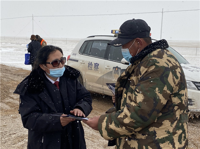 治多县是全国地区海拔最高、人均占有面积最大、生态位置最为重要的县城之一,在这里办案,车辆出状况是常有的事。2021年4月21日,年某到该院寻求帮助,希望能通过法律途径要回工资。索南拉毛向年某了解了师某拖欠工资的具体情况后,便于4月23日早上9点赶往索加乡。索加乡海拔4647米,出发的时候就是风雪交加,直到下午4点才到达师某所在地。索南拉毛以支持起诉人的身份参与调解,耐心地对师某进行释法说理,最终促成双方当事人达成调解协议,师某第二天赶赴治多县检察院,当面向年某支付拖欠的1.2万余元劳务费。