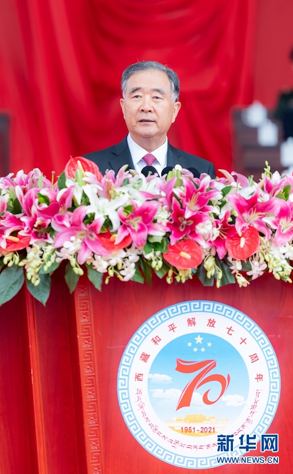 在热烈的掌声中,汪洋发表了热情洋溢的讲话。他说,在举国欢庆中国共产党百年华诞之际,我们迎来了西藏和平解放70周年。上个月,中共中央总书记、国家主席、中央军委主席习近平亲临西藏考察,充分肯定西藏和平解放70年来的发展成就,为各族干部群众带来亲切关怀和美好祝福。今天,中央代表团带着党中央和习近平总书记的重托、带着全国人民的深情厚谊,与西藏各族人民一道隆重庆祝西藏和平解放70周年。汪洋代表中共中央、全国人大常委会、国务院、全国政协、中央军委,向西藏自治区表示热烈祝贺;向西藏各族干部群众致以亲切问候;向长期以来关心和支持西藏发展进步的各界人士表示衷心感谢。