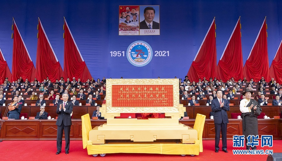 庆祝西藏和平解放70周年大会隆重举行 中共中央全国人大常委会国务院全国政协中央军委致电祝贺 习近平在贺匾上题词“建设美丽幸福西藏 共圆伟大复兴梦想” 汪洋出席大会并讲话