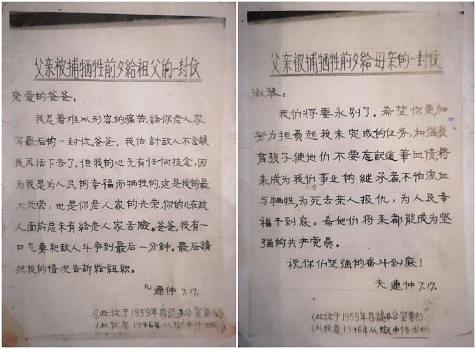 我们将要永别了,希望你更加努力担负起我未完成的任务。加强教育孩子,使他们不要忘记这笔血债。将来成为我们事业的继承者,不怕流血与牺牲,为死去的亲人报仇,为人民的幸福干到底。希望他们将来都能成为坚强的共产党员。