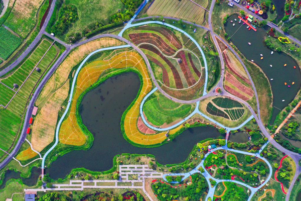 2021年5月2日,空中俯瞰浙江省杭州市余杭区径山镇的千亩缤纷花海(无人机照片)。新华社记者 徐昱 摄