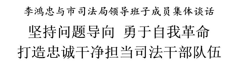 7日,市委书记、市政法队伍教育整顿领导小组组长李鸿忠到市司法局与班子成员面对面集体谈话。李鸿忠强调,要深入学习贯彻习近平总书记“七一”重要讲话精神和关于政法队伍教育整顿的重要指示精神,坚持问题导向,勇于自我革命,扎实推进教育整顿,打造忠诚干净担当的司法干部队伍。