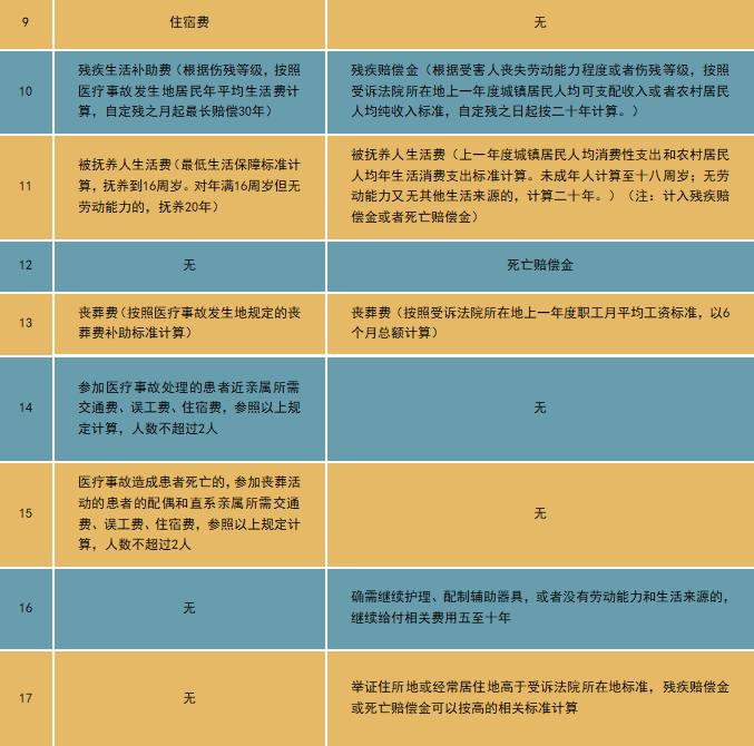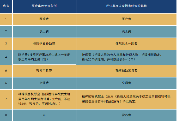 《民法典》及《人身损害赔偿的解释》与《医疗事故处理条例》的赔偿项目和标准比较,见下表: