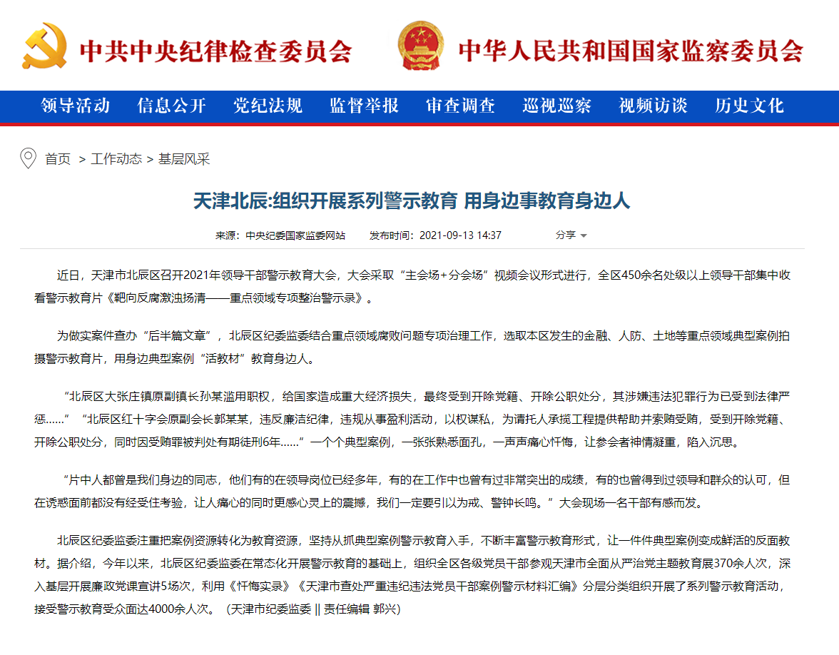 北辰区纪委监委注重把案例资源转化为教育资源,坚持从抓典型案例警示教育入手,不断丰富警示教育形式,让一件件典型案例变成鲜活的反面教材。据介绍,今年以来,北辰区纪委监委在常态化开展警示教育的基础上,组织全区各级党员干部参观天津市全面从严治党主题教育展370余人次,深入基层开展廉政党课宣讲5场次,利用《忏悔实录》《天津市查处严重违纪违法党员干部案例警示材料汇编》分层分类组织开展了系列警示教育活动,接受警示教育受众面达4000余人次。