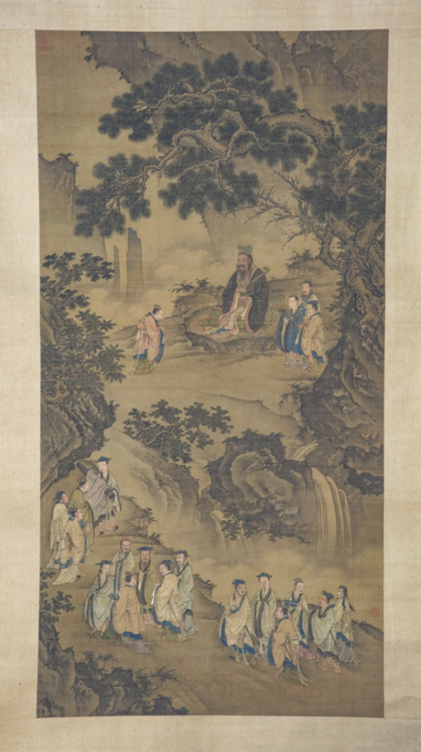孔子讲学图轴,绘孔子于山林瀑布之间讲学的情景,现藏于孔子博物馆。孔子手持如意,怀揽凭几,端坐在松杏之下的平石上。其前一弟子躬身请教,其左则有侍立弟子三人。另外的十六名弟子沿山道而上,彼此顾盼,交谈自若。(资料图片)