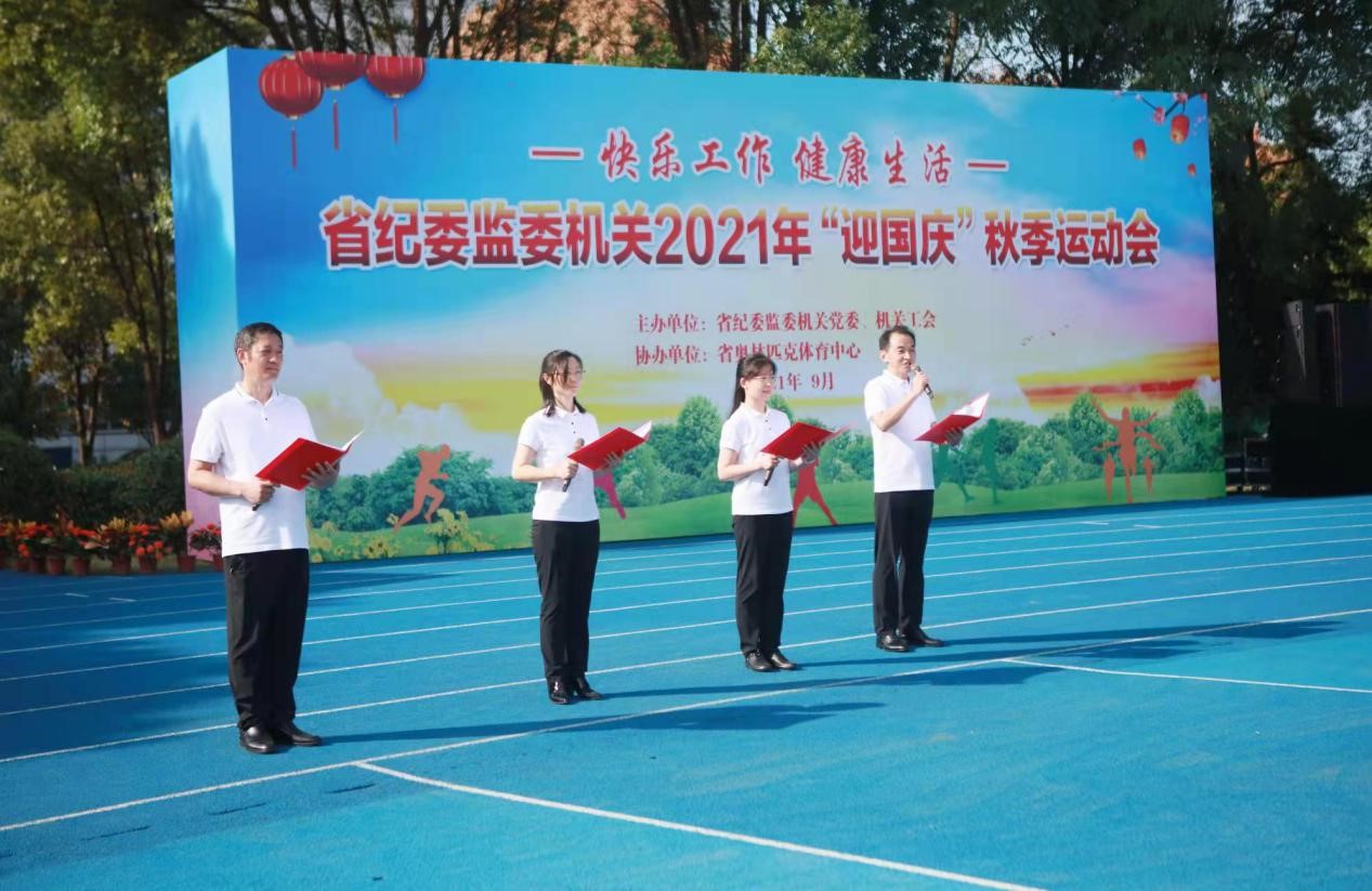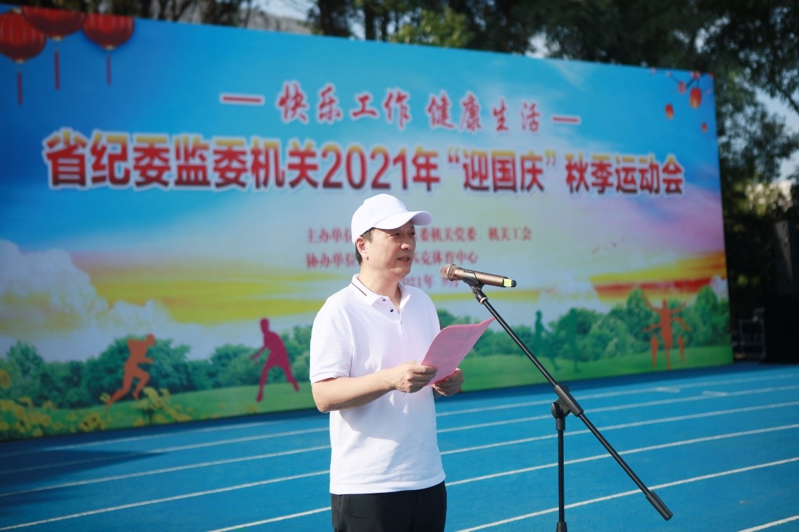 “我宣布,快乐工作,健康生活,省纪委监委机关2021年‘迎国庆’秋季运动会开幕!”9月25日上午八点半,在省纪委副书记、省监委副主任张忠凯同志宣布后,委机关秋季运动会激情开赛,机关各部室及派驻机构近500名干部在奥体中心运动场上开始了紧张而精彩的竞技角逐。